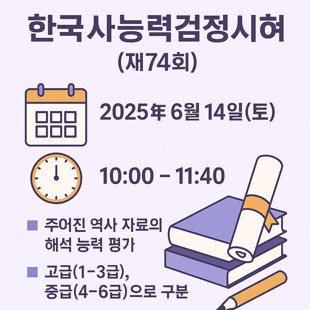 시험장 입실 시간, 준비물, 최신 변경사항까지! 2025년 제74회 한국사능력검정시험 직전 반드시 알아야 할 모든 정보를 한눈에 정리했습니다. 합격을 향한 마지막 점검, 지금 바로 시작하세요.
